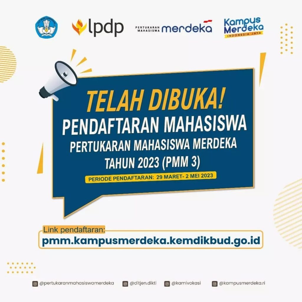 Pertukaranmahasiswamerdeka Halo Sahabat Merdeka! Mari menjadi bagian dalam merayakan kebinekaan! Menjadi generasi bangsa yang toleran, berwawasan serta berbudaya.Kami informasikan bahwa masa pendaftaran Mahasiswa PMM 3 telah dibuka! Periode pendaftaran 29 Maret – 2 Mei 2023.Pendaftaran melalui laman: https://pmm.kampusmerdeka.kemdikbud.go.id/ (mulai dapat dilakukan pukul 10:00 WIB hari ini ya)Yuk persiapkan diri kamu dan segera mendaftar!Bertukar sementara, bermakna selamanya.Salam Hangat#pmm3#pmm#kampusmerdeka